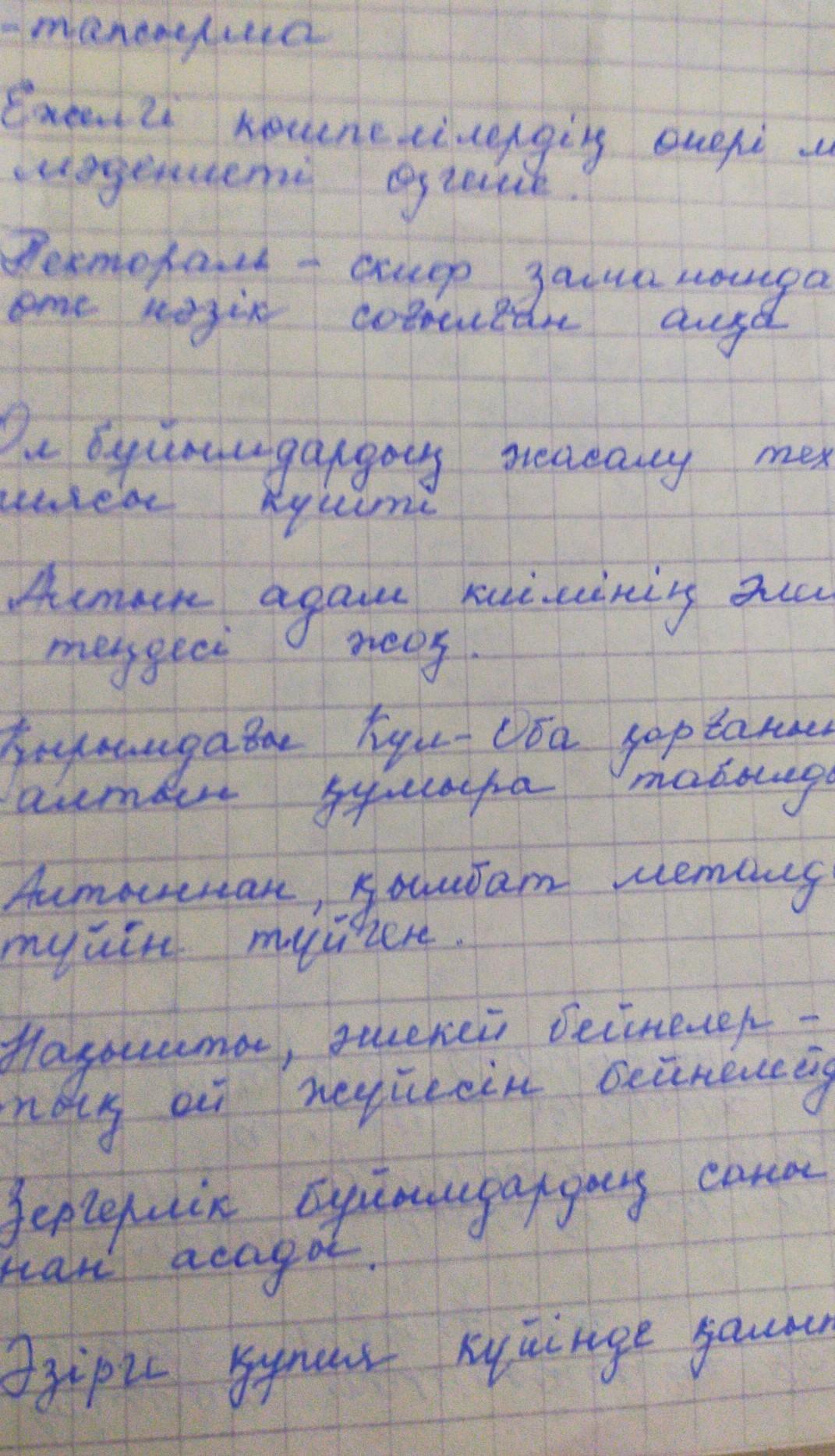 -тапсырма 91-бет Мәтін бойынша сөздерді тіркестіріп жаз. Сын есімдерді тауып, астын сыз. Ежелгі көшпелілердің жасалу технологиясы күшті Алтыннан, қымбат металдан ғарыштық ой-жүйесін бейнелейді. Пектораль – скиф заманындағы өте нәзік соғылған алқа. Нақышты, әшекей бейнелер - ғажайып өнер туындысы. Ол бұйымдардың алтын құмыра табылды. Зергерлік бұйымдардың саны күйінде қалып отыр. Алтын адам киімінің өнері мен мәдениеті өзгеше. Әзірге құпия түйін түйген. Қырымдағы Күл-Оба қорғанынан әлемде теңдесі жоқ. Адамзат тарихындағы 4000-нан асады. Помогите пж!!!!
