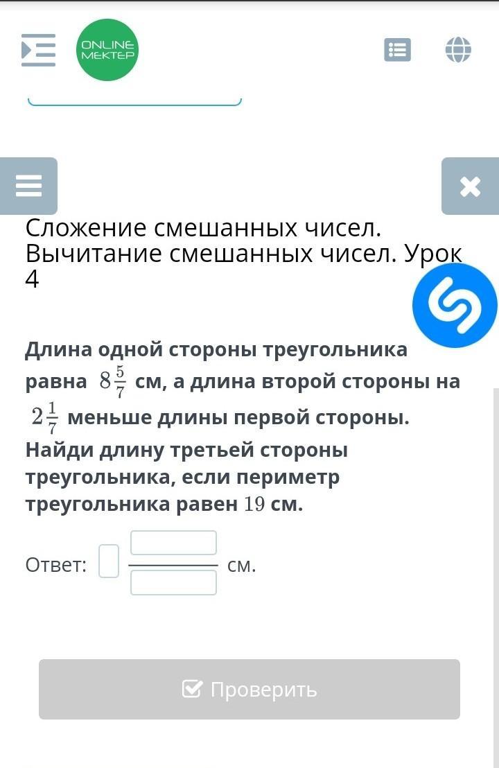 Это длина второй. Потом нужно это всё прибавить чтобы найти сумму первой и второй. = 8 5/7 + 6 4/7 = 14 9/7 переведем это в правильную дробь будет 15 2/7 Потом от 19 (от суммы) отнимаем 15 2/7. Надо 19 перевести в Смешанное число 18 7/7 - 15 2/7 = 3 5/7 Ответ-3 5/7
