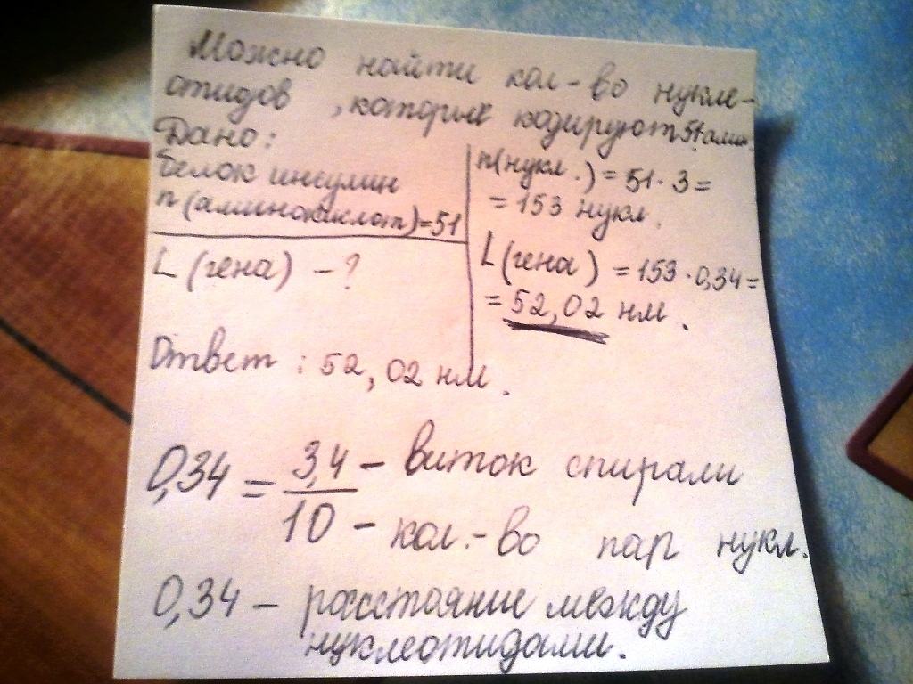 Какая длина гена, который кодирует синтез инсулина, если известно, что в его состав входит 51 аминокислотный остаток?