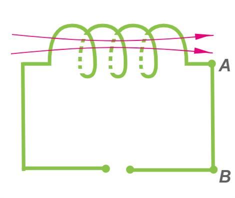 Внимательно рассмотри рисунок, на котором указано направление магнитных линий в соленоиде. Определи направление тока на участке AB.