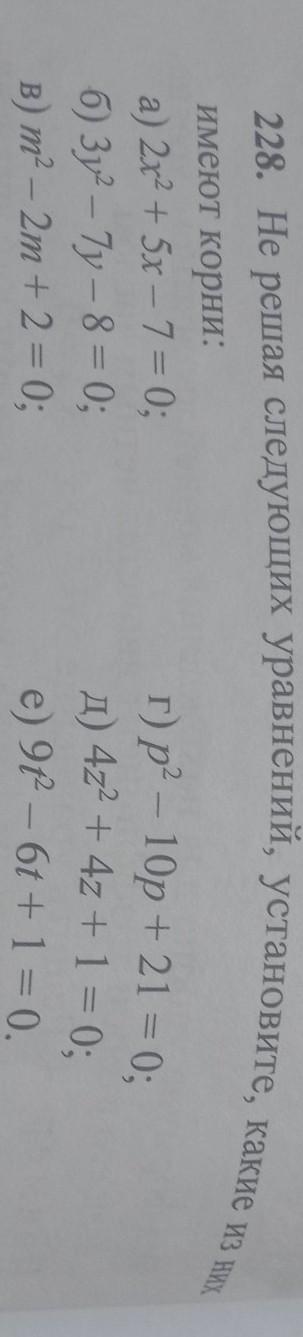 Тупо считаем дискриминант: если больше нуля - 2 корня, меньше нуля - нет корней, равен нулю - 1 или 2 одинаковых корня (Вероятно, вам ещё не объясняли про 2 одинаковых корня так, что д) и е) их в ответ писать не стоит)