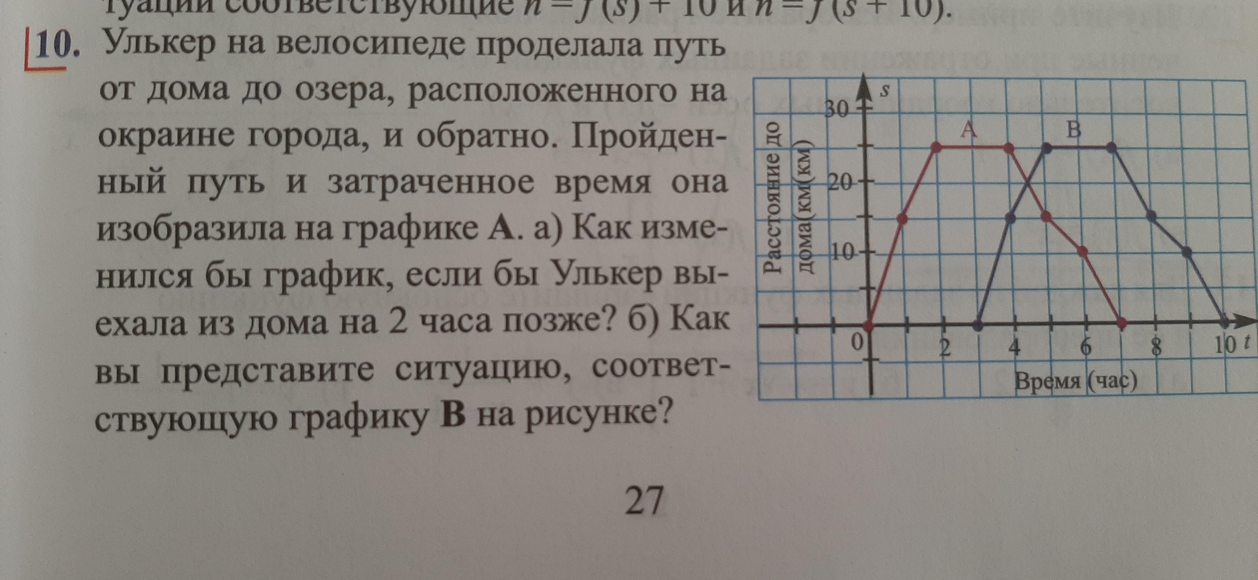 Улькер на велосипеде проделала путь от дома до озера, расположенного на окраине города, и обратно. Пройден- ный путь и затраченное время она изобразила на графике А. а) Как изме- нился бы график, если бы Улькер вы- eхала из дома на 2 часа позже? б) Как вы представите ситуацию, соответ- ствующую графику В на рисунке?