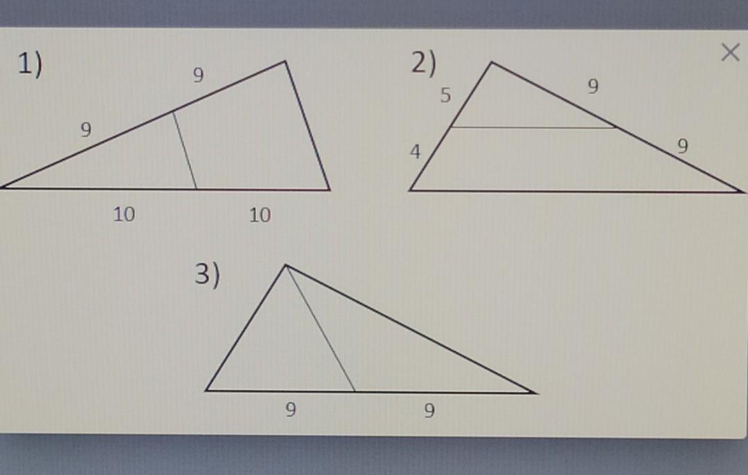 Укажите номер рисунка, на котором изображена средняя линия треугольника.