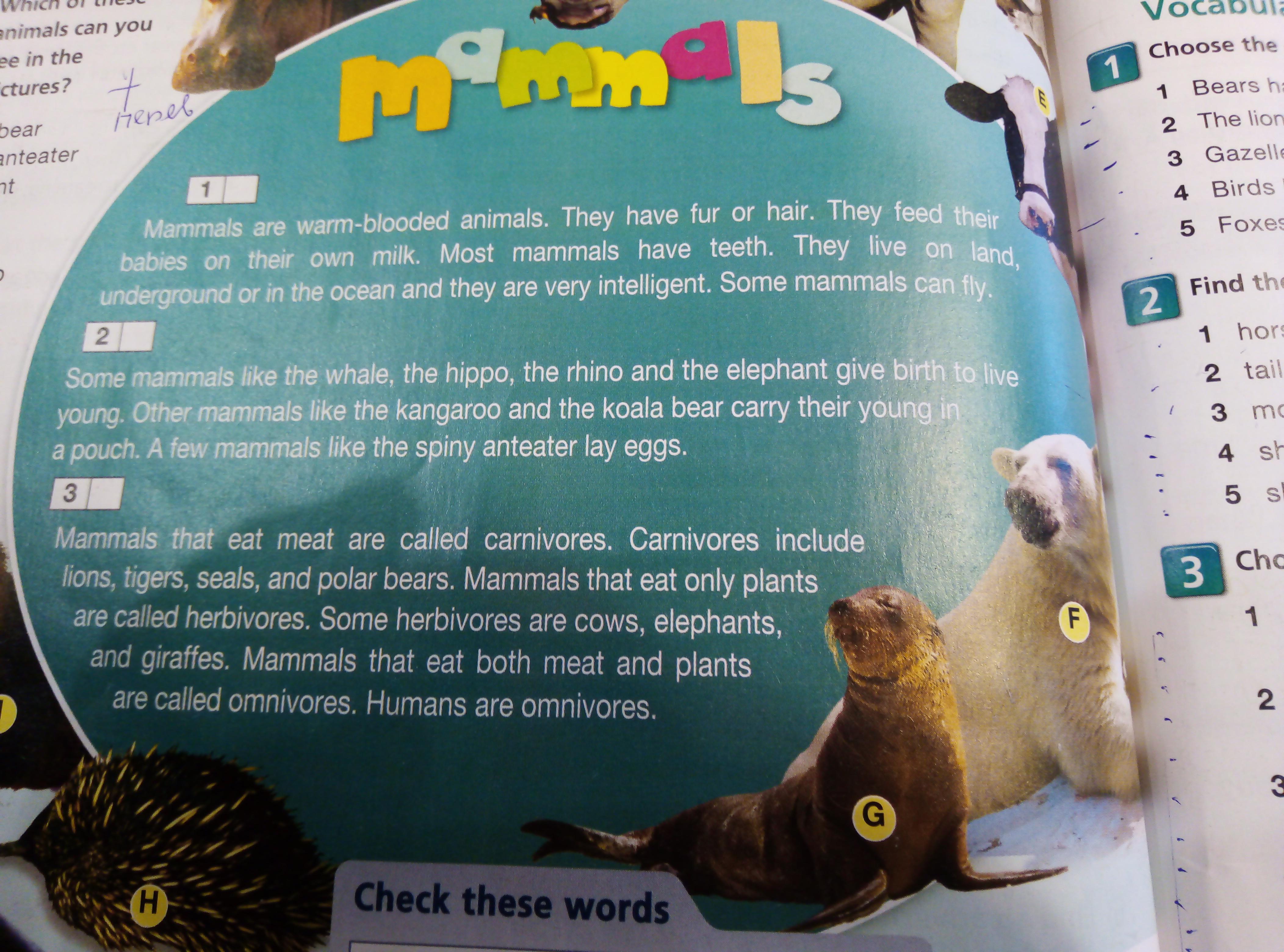 Mammals are warm-blooded animals. Most mammals have teeth. They live on land underground or in the ocean and they are very intelligent. Some mammals can fly . A few mammials like the spiny anteater lay eggs. Marmmals that eat meat are caled carnivores. Marmmals that eat only plants are called herbivores. Mammals that eat both meat and plants are called omnivoresomnivores.