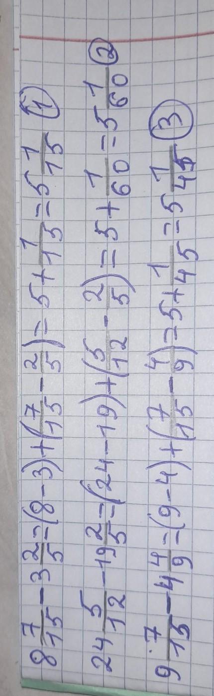 Найди значение разности. 1) 8 7/15 - 3 2/5 2)24 5/12 - 19 2/5 3) 9 7/15 - 4 4/9 ПОМОГИТЕ