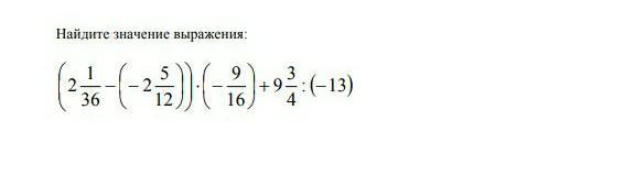 (2 1/36(2 5/12))*(-9/16)+9 3/4 : -13= 4 4/9 * (-9/16)+ 9 3/4:(-13)= -2 1/2+ 9 3/4:(-13)=7 1/4:(-13)= 29/52