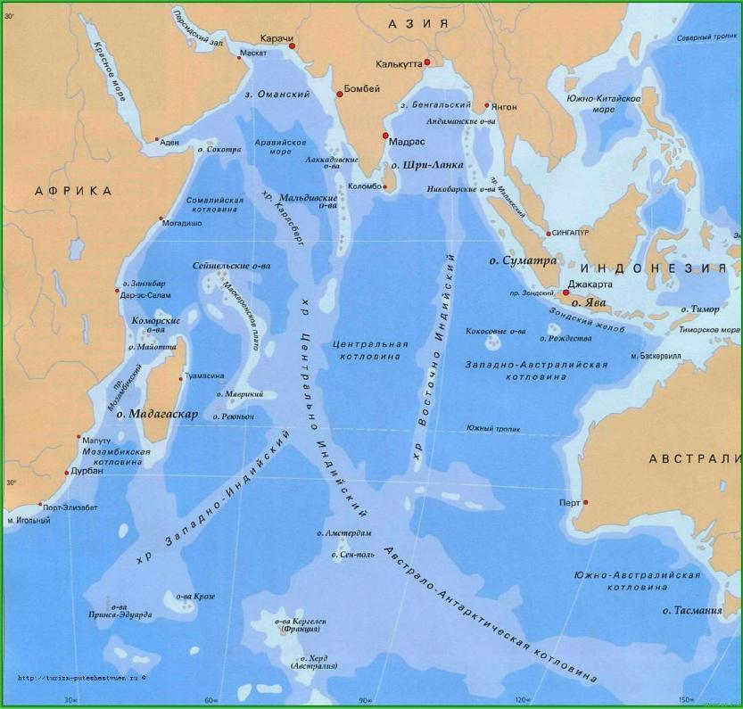 Делится глубоководными хребтами на три части Индийский океан.Дно океана разделено срединно-океаническими хребтами на три части, которые расходятся из центра в разные стороны.
