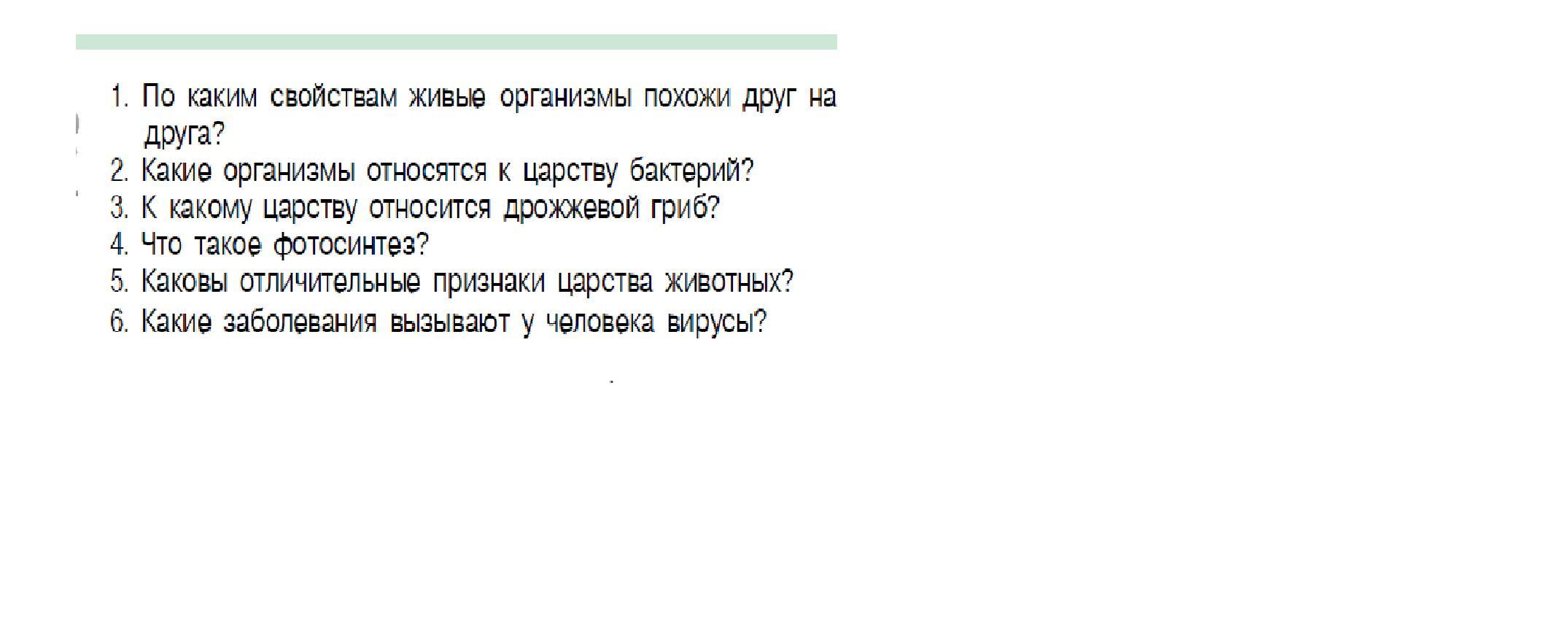 1. По каким свойствам живые организмы похожи друг на друга? 2. Какие организмы относятся к царству бактерий? 3. К какому царству относится дрожжевой гриб?