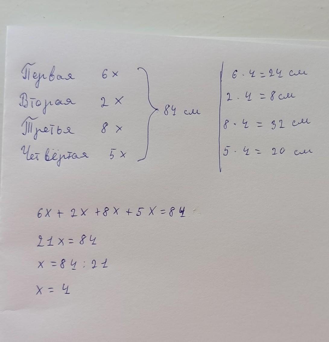 Стороны трапеции соотносятся как 6:2:8:5, а периметр её равен 84 см.