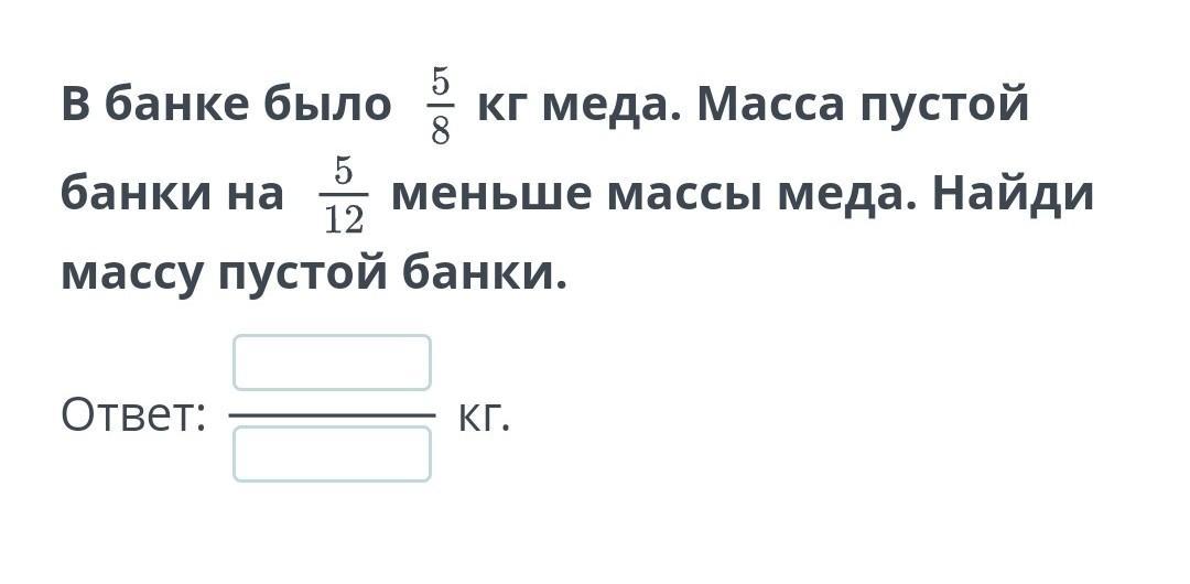 5/8 дополнительный множитель 3 - 5/12 дополнительный множитель 2 =15/24 - 10/24 = 5/24(кг)