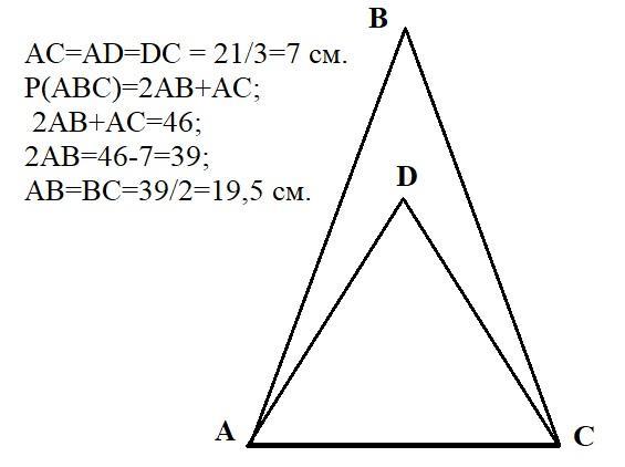 Периметр равнобедренного треугольника ACB с основанием AC равен 46 см, а периметр равностороннего треугольника ACD равен 21 см.