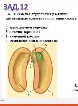 В эндосперме находятся питательные вещества для зародыша семени, если эндосперма нет, питательные вещества находятся в семядолях. Эндосперм образуется при слиянии двойного набора хромосом вегетативной клетки с одним набором хромосом спермия. Общие признаки семян двудольных и однодольных растений: А- имеют семенную кожуру и зародыш, состоящий из семядолей, зародышевого корешка, стебелька и почечки