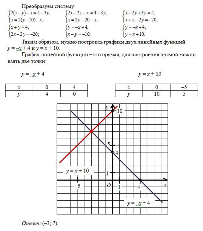 Реши систему уравнений графическим способом {2(х-у)-х=4-3у х=2(у-10)-х