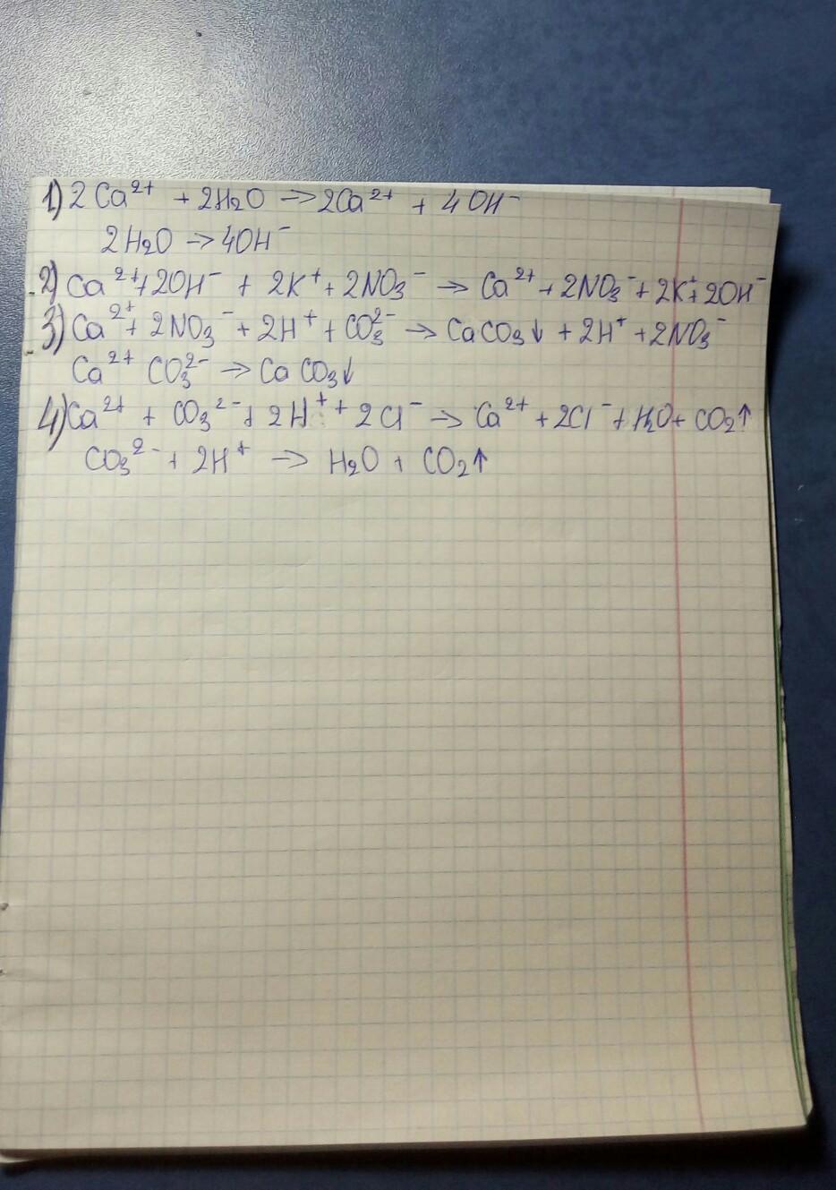 Осуществить превращения; для реакций, протекающих в водном растворе с участием ионов, составить уравнения реакций в ионном виде: кальций → гидроксид кальция → нитрат кальция → карбонат кальция → хлорид кальция.