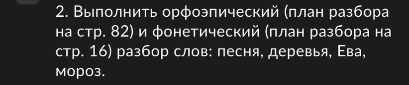 Выполнить орфоэпический разбор слов: песня, деревья, Ева, мороз.