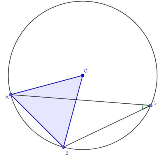Решение: Так как по условию OA = OB = AB, то треугольник ΔAOB - правильный, следовательно по свойствам правильного треугольника все его углы равны 60°, тогда ∠AOB = 60°. Градусная мера дуги равна градусной мере центрального угла, который опирается на эту дугу, тогда ∪AB = ∠AOB = 60°. По теореме градусная мера вписанного угла равна половине дуги, на которую он опирается, тогда