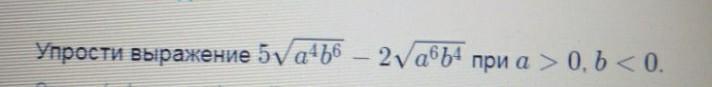 5 \sqrt{ {a}^{4} {b}^{6}  }  - 2 \sqrt{ {a}^{6}  {b}^{4} }  =  5 {a}^{2} ( -  {b}^{3} ) - 2 {a}^{3} ( -  {b}^{2} ) =  - 5 {a}^{2}  {b}^{3}  + 2 {a}^{3}  {b}^{2}  =  {a}^{2}  {b}^{2} ( - 5b + 2a) =  {a}^{2}  {b}^{2} (2a - 5b)