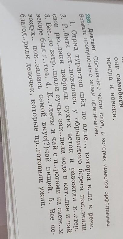 1.Отряд туристов шёл по алее,которая вела к реке.2.Ребята остановились у обрывистого берега,положили свои рюкзаки,набрали сухих веток и разожгли костёр.3.Весело затрещали сучья,закипела вода в котелке,и чай вскоре был готов.4.Котлеты и чай с пирогами на свежем воздухе показались самой вкусной пищей.5.Все поблагодарили девочек,которые приготовили ужин.