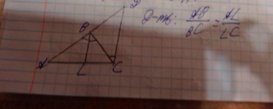 Составим пропорцию: АL/LС=АВ/ВД. Сравнивая эту пропорцию с той, которую нужно доказать, замечаем, что они отличаются только отрезками ВД и ВС. Рассмотрим эти отрезки. Они входят в ΔСВД, в котором∠ Д=∠АВL (как соответственные при ДС║ВL и секущей АД) и ∠ВСД=∠СВL. Но ∠АВL=∠СВL (ВL — биссектриса), отсюда ∠Д=∠ВСД. Следовательно, ВД=ВС. Заменим в полученной пропорции ВД на ВС: АL/СL=АВ/ВС