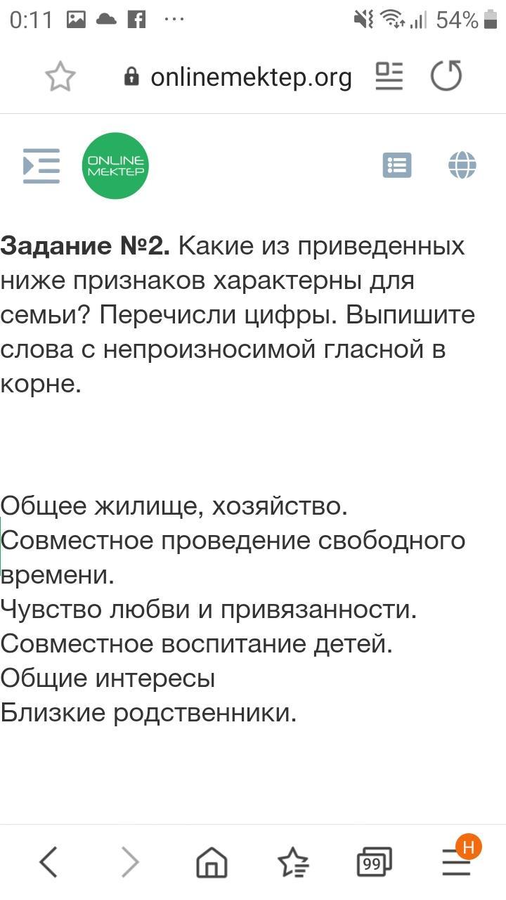 Задание №2. Какие из приведенных ниже признаков характерны для семьи? Перечисли цифры. Выпишите слова с непроизносимой гласной в корне.