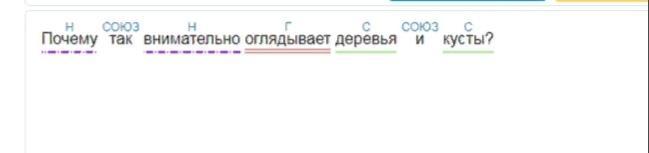 Синтаксический разбор предложения "Почему так внимательно оглядывает деревья и кусты?"