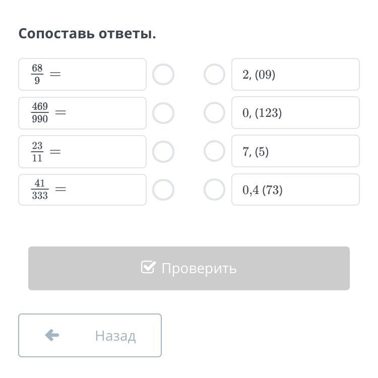 68/9 = 7,(5) ; 469/990 = 0,4(73) ; 23/11 = 2,(09) ; 41/333 = 0,(123)
