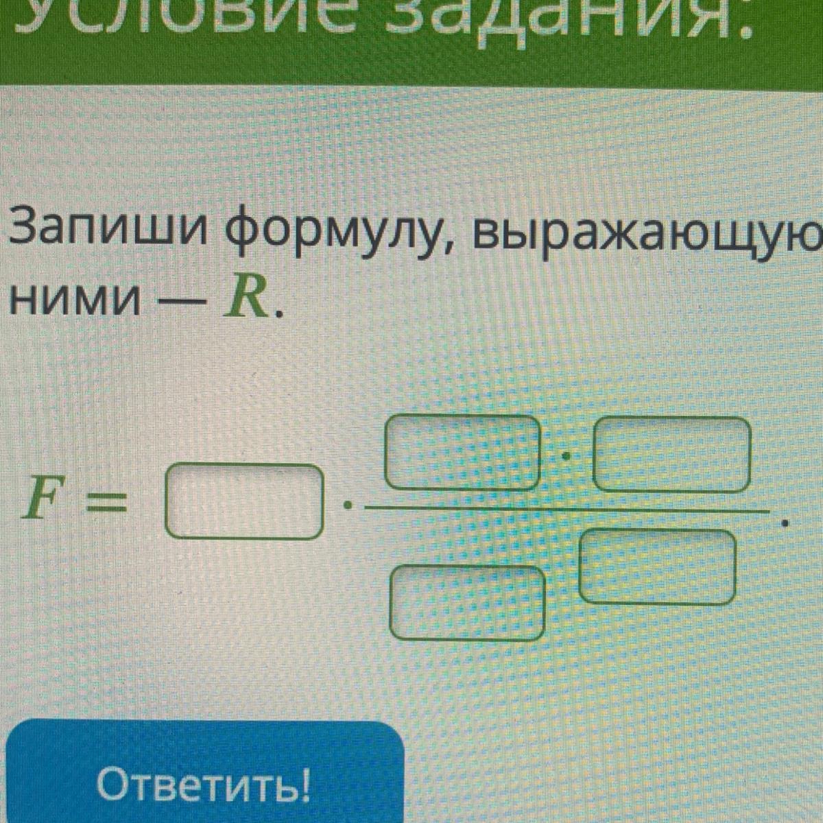 Запиши формулу, выражающую закон всемирного тяготения, если массы тел - M и m, а расстояния между ними - R.