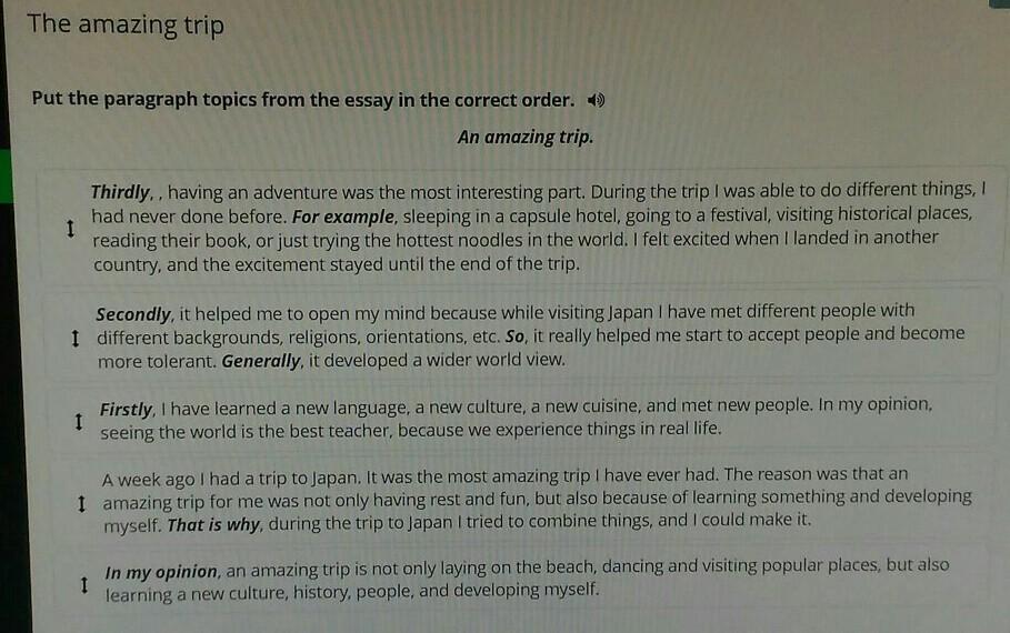 1) A week ago I had a trip to Japan. It was the most amazing trip I have ever had. The reason was that an amazing trip for me was not only having rest and fun, but also because of learning something and developing myself. That is why, during the trip to Japan I tried to combine things, and I could make it.