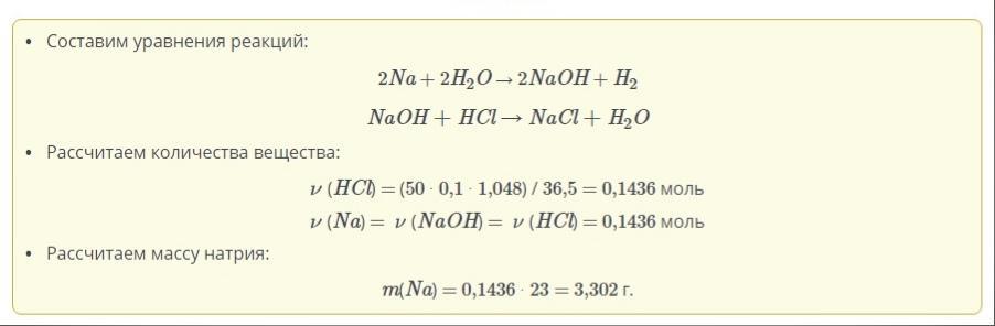 Для нейтрализации раствора, полученного растворением натрия в воде, использовали 50 мл раствора с массовой долей соляной кислоты 10% и плотностью 1,048 г / см3. Определите массу натрия.