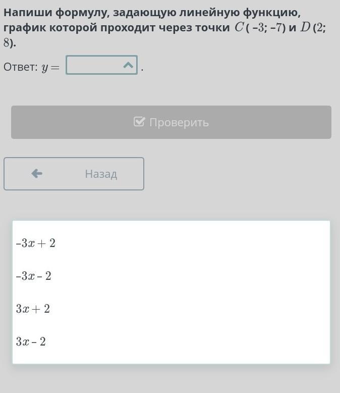 Напиши формулу, задающую линейную функцию, график которой проходит через точки C ( –3; –7) и D (2;8)