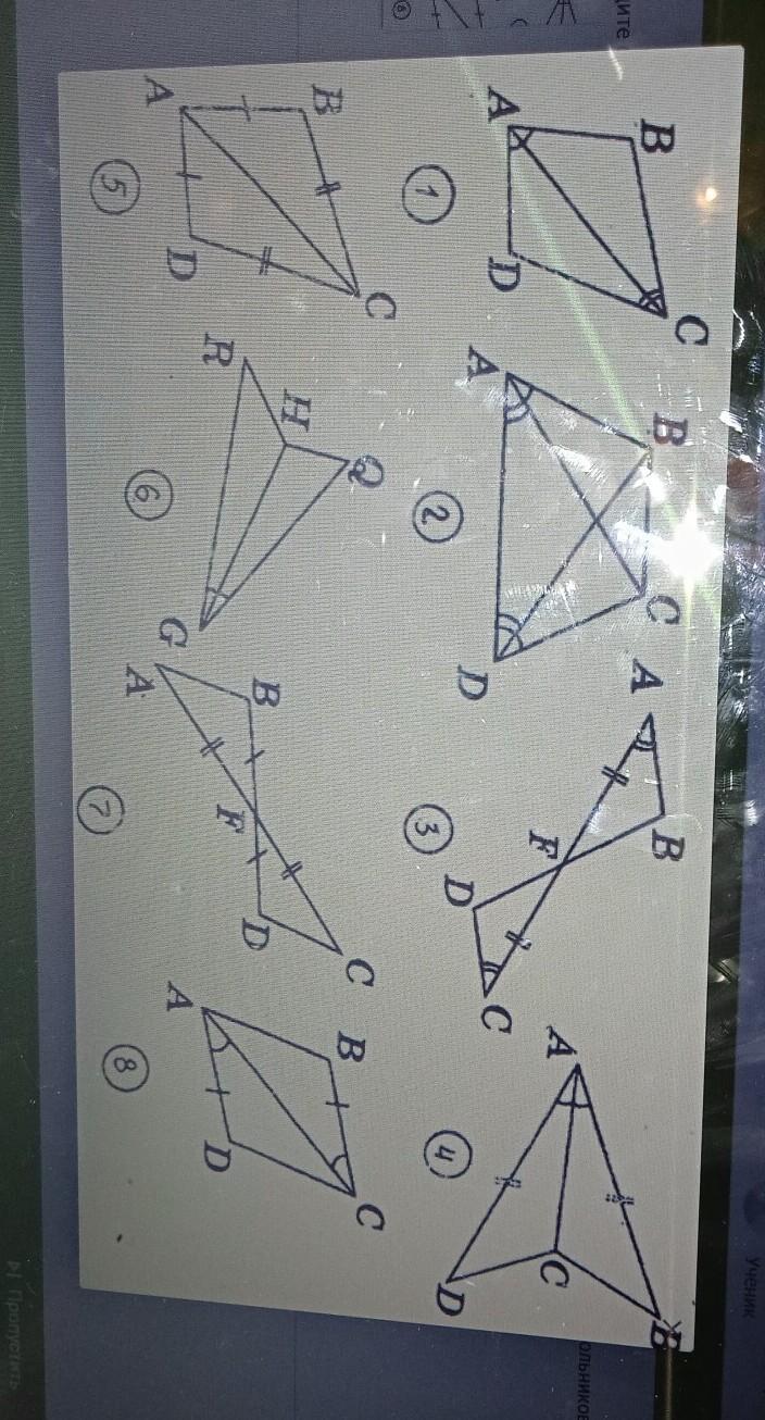 Рассмотрите рисунки. Найдите обозначения равных элементов в треугольниках. Определите, на каком рисунке треугольники равны по ll признаку равенства треугольников.