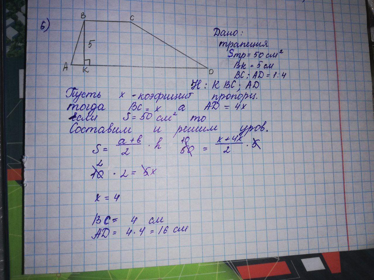 площадь трапеции равна 50 см в квадрате А ее высота равна 5 см Найдите основание трапеции если они относятся как 1 : 4 пожалуйста очень срочно надо
