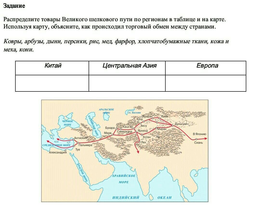 Из Китая по Шелковому пути везли шелк, бронзовые зеркала, а в обратную сторону — породистых лошадей, хлопок и нефрит из Азии. Помимо товаров по Шелковому пути распространялись религии и технологии, причем многие технологии (например производство бумаги, пороха, шелка) — из Китая на запад
