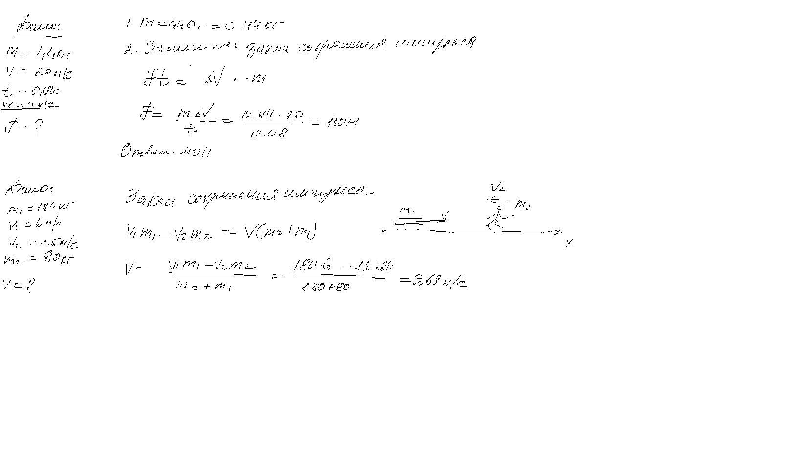 2) Тележка массой = 180 кг движется со скоростью V1 = 6 м/с. Человек, бегущий навстречу тележке со скоростью V2 = 1,5 м/с, прыгает на тележку. С какой скоростью V движется после этого