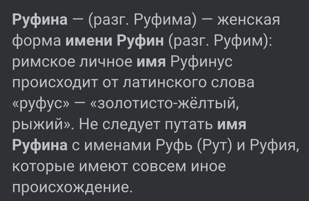 женская форма имени Руфин римское личное имя Руфинус происходит от латинского слова "Руфус"- золотисто-желтый рыжий оно однокоренное с именами роза Русана ,Росита