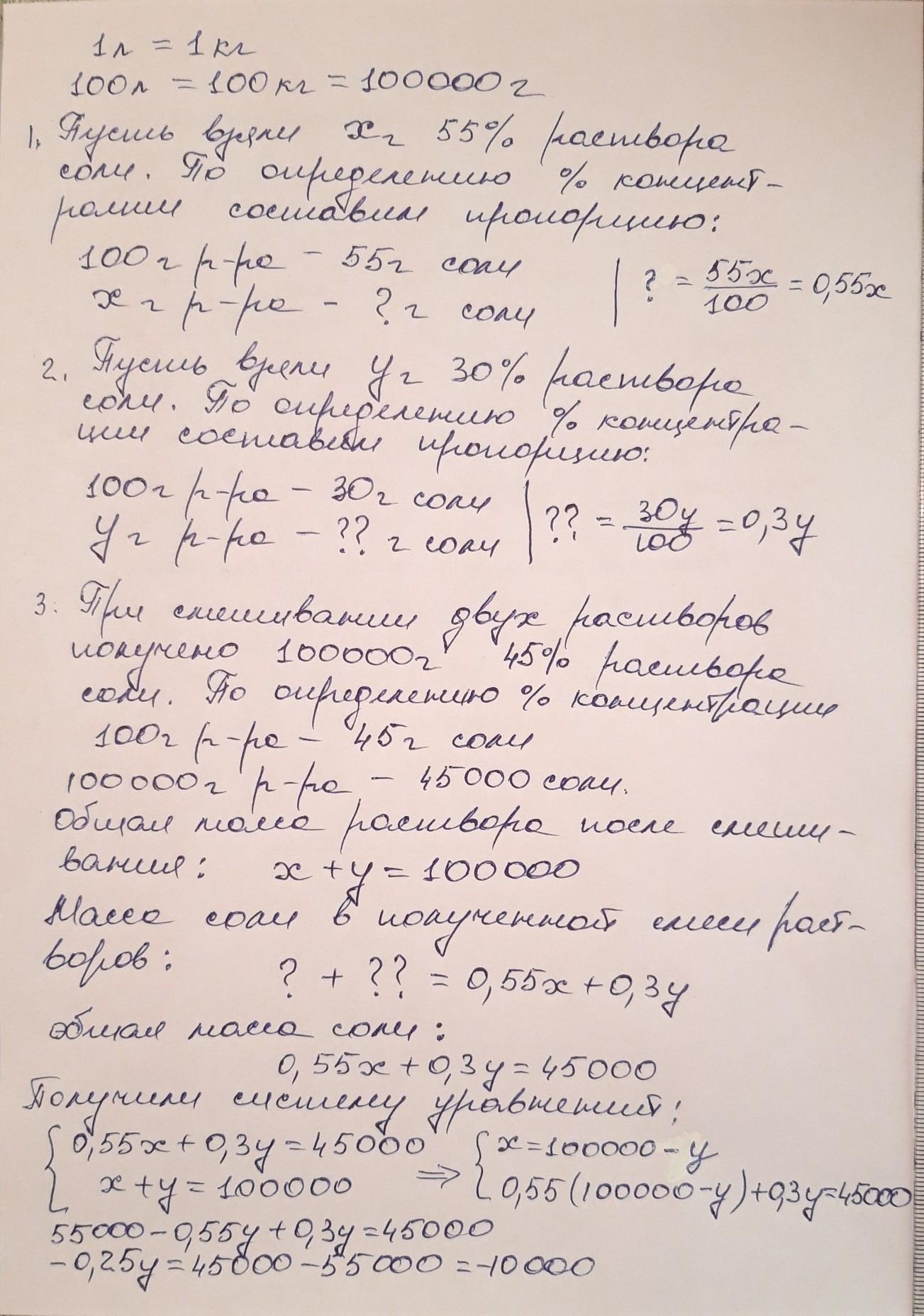 Чтобы получить 100 литров 45% раствора соли, добавьте 55% и 30% использовались сплавы. Сколько литров каждого раствора было использовано?
