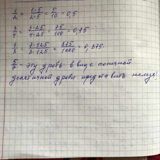 Запиши дробью можно записать в виде конечных десятичных дробей 1/2 3/4 5/7 7/8 помогите пожалуйста мне очень надо