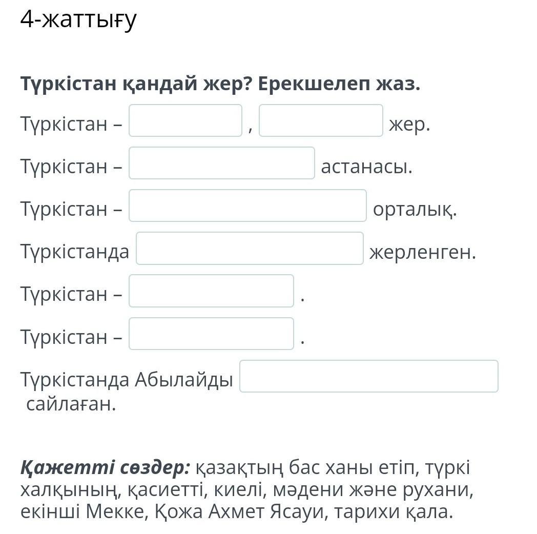 Қажетті сөздер: қазақтың бас ханы етіп, түркі халқының, қасиетті, киелі, мәдени және рухани, екінші Мекке, Қожа Ахмет Ясауи, тарихи қала.