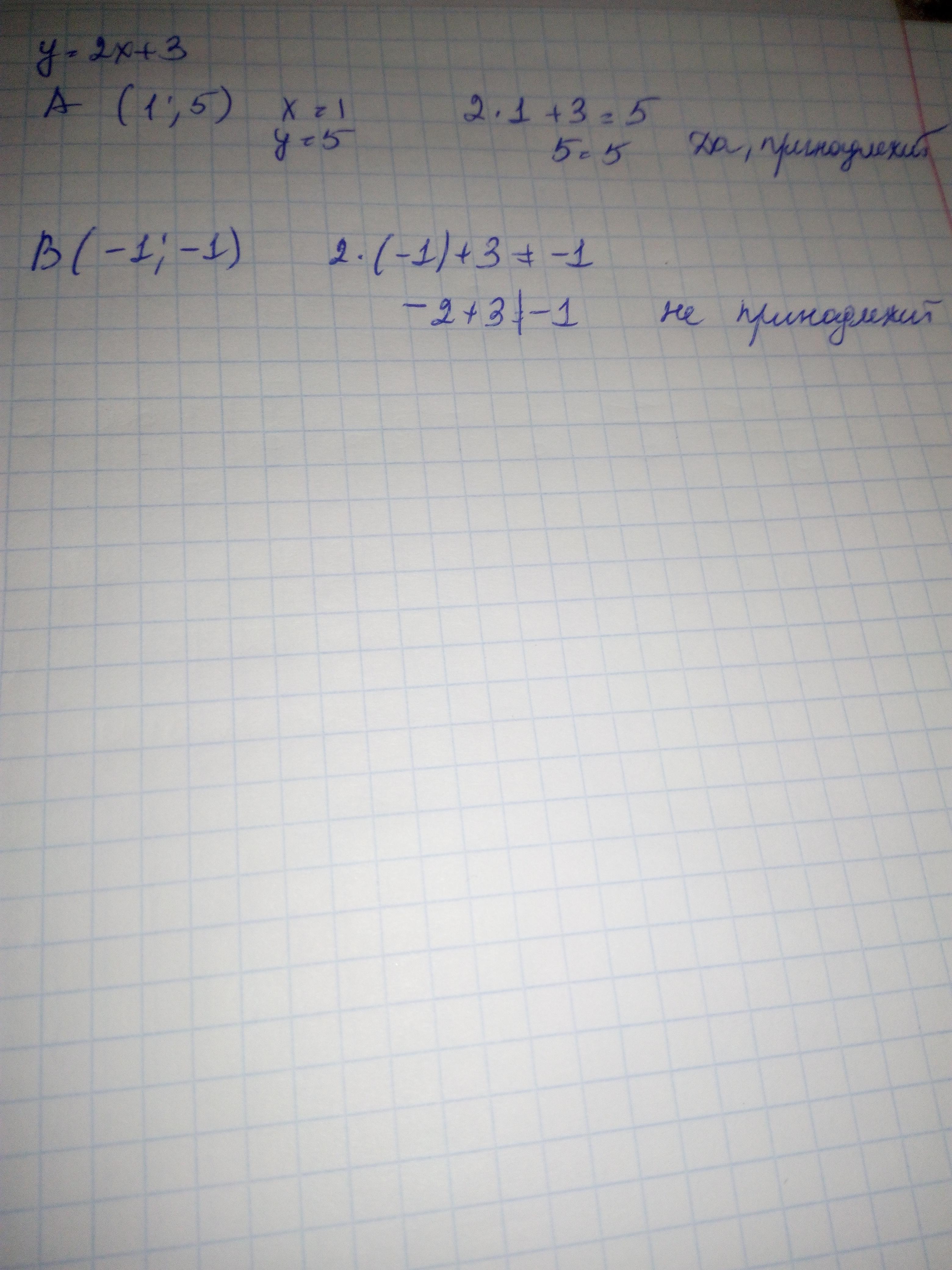 Функция задана формулой у = 2х + 3. Принадлежат ли графику функции точки А (1; 5) и В (–1; –1)? (Без чертежа, подставляйте значения в функцию! )