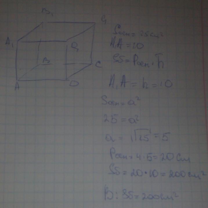 Знайдіть площу основи правильної чотирирічної призами , якщо їх діагональ =10 см ,а бічне ребро8 см