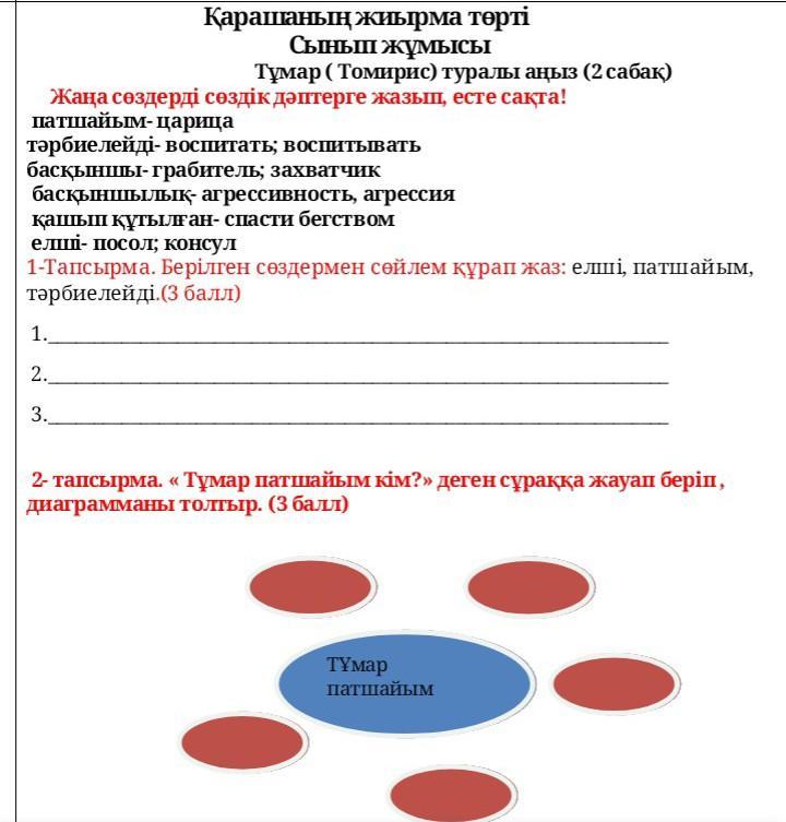 « Тұмар патшайым кім?» деген сұраққа жауап беріп , диаграмманы толтыр.