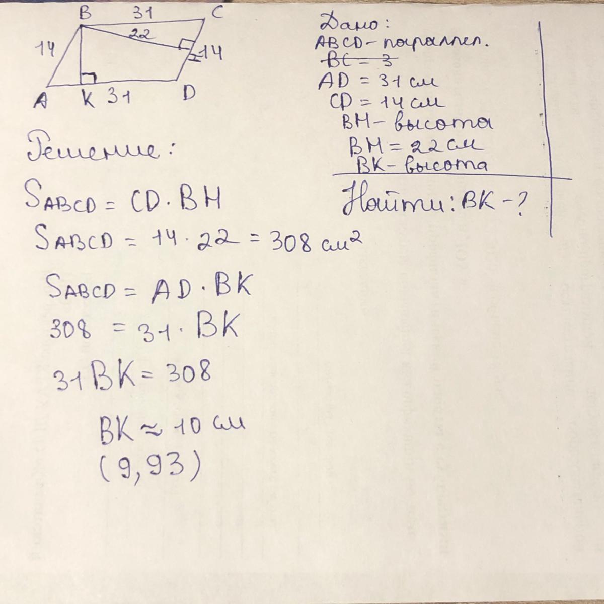 Стороны параллелограмма 31см и 14см. Высота, проведённая к меньшей стороне, равна 22см. Найти высоту, проведённую к большей стороне.