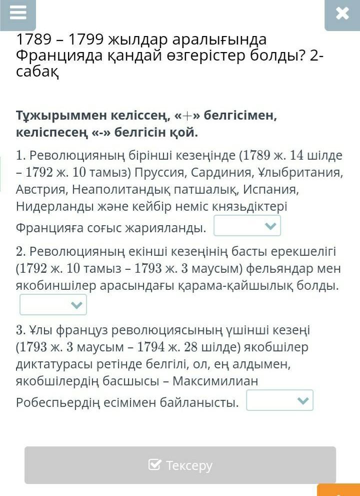 2.Революцияның екінші кезеңінің басты ерекшелігі (1792 ж. 10 тамыз – 1793 ж. 3 маусым) фельяндар мен якобиншілер арасындағы қарама-қайшылық болды.(-)