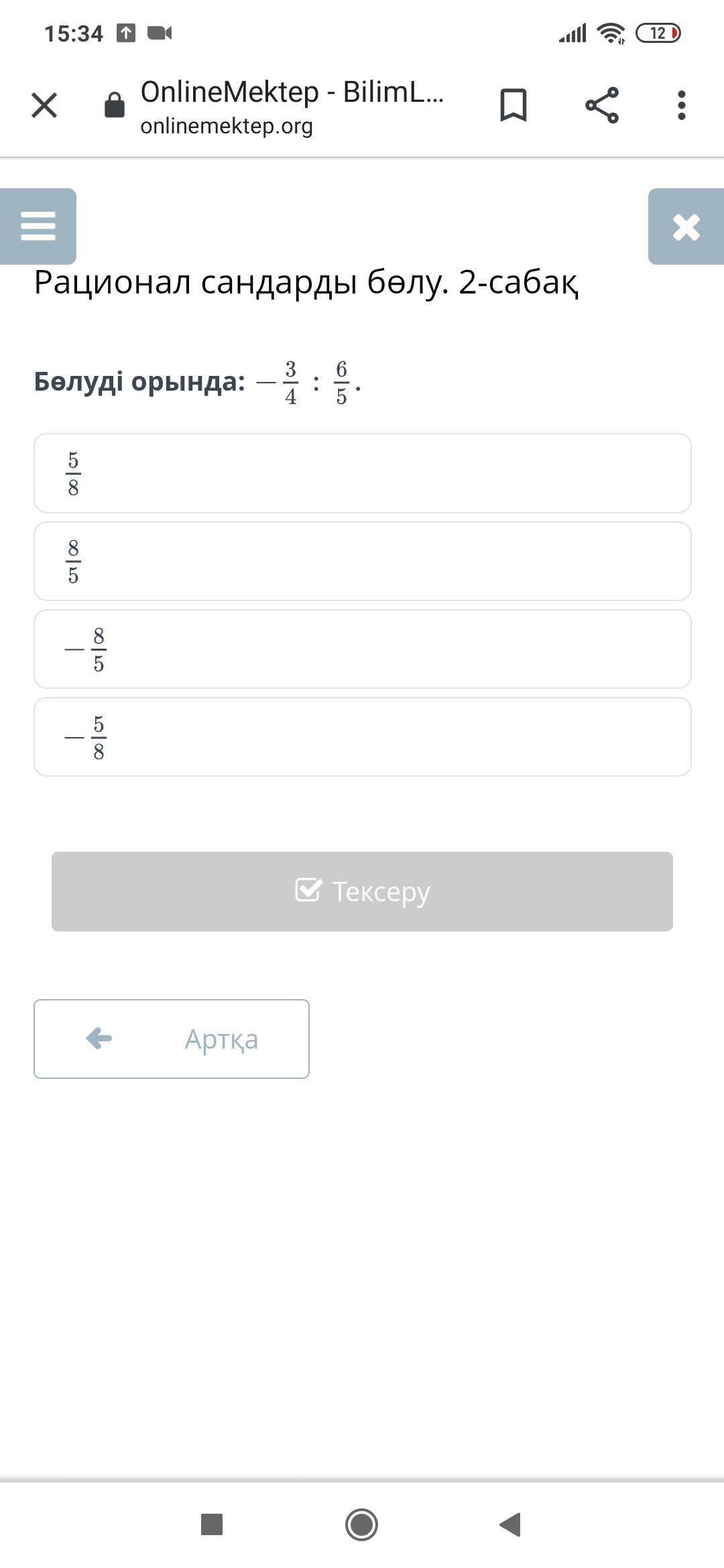 ТатМих: - 3/4 : 6/5=-3/4*5/6=-15/24=-5/8