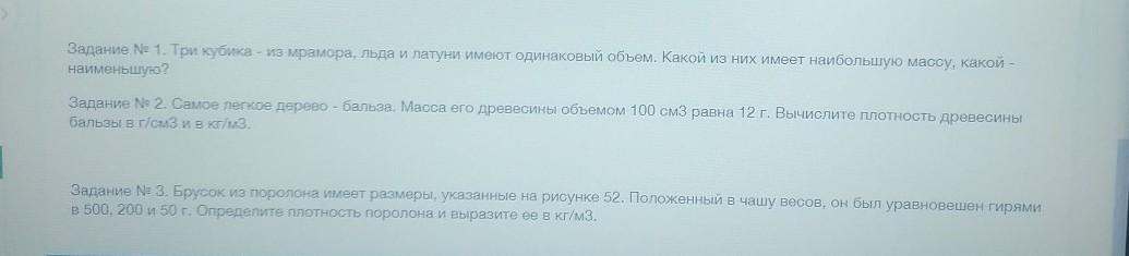 1, Ответ: Поскольку объемы одинаковы, рассмотрим массу 1 м3 веществ. Наибольшую массу имеет кубик латуни, а наименьшую кубик льда.