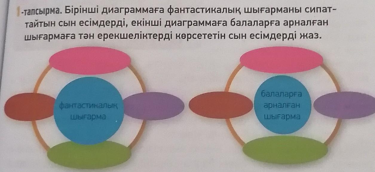1-тапсырма. Диаграмма толтыру. Фантастикалық шығармаларды сипаттайтын және балаларға арналған шығармаларды сипаттайтын сын есімдерді жазу. дам 50 баллов