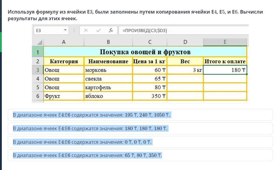 В диапазоне ячеек Е4:Е6 содержатся значения :195тг, 240тг, 1050тг.