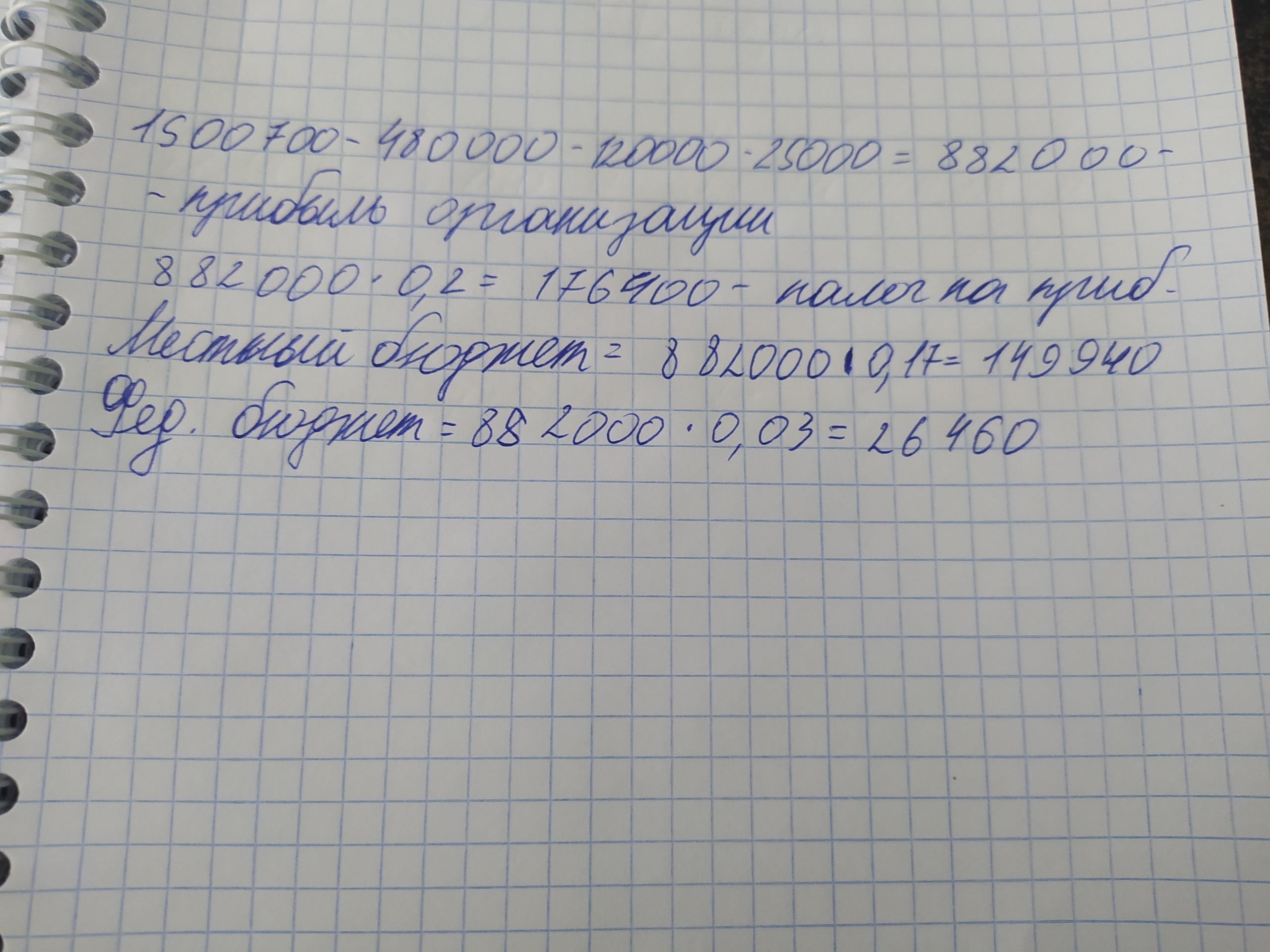 За отчетный период организацией было реализовано продукции на 1 500 700 руб., на ее производство было израсходовано: материалы – 480 000 руб., на оплату труда – 120 000 руб., амортизация – 25 000 руб. Исчислить налог на прибыль и распределить его между бюджетами.