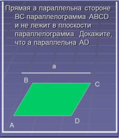 Прямая а параллельна стороне ВС параллелограмма ABCD и не лежит в плоскости параллелограмма. Докажите, что а параллельна AD