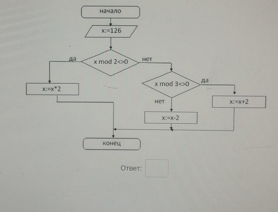 Выполните алгоритм, изображённый на блок-схеме, и найдите значение переменной Х.